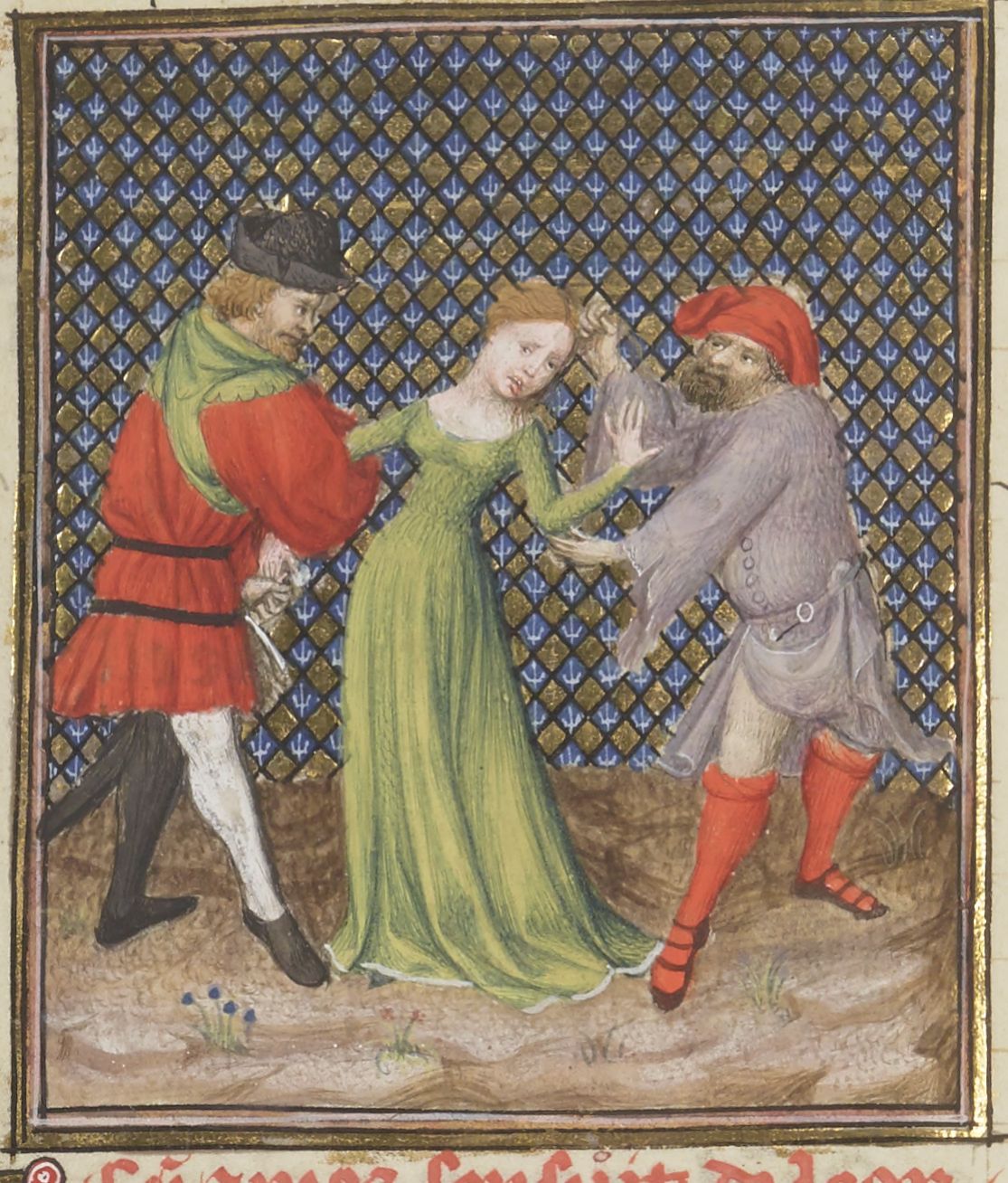 Parigi, Bibliothèque Nationale de France, Fr. 12420, f. 76v. Due aguzzini torturano Leena, la quale si morde la lingua per non tradire i suoi compagni.