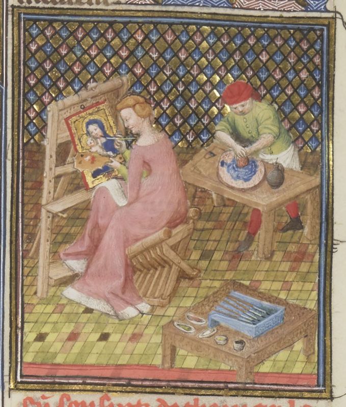 Parigi, Bibliothèque Nationale de France, Fr. 12420, f. 86r. Tamari dipinge un ritratto di Diana (rappresentata come una Madonna con Bambino) mentre un aiutante di bottega prepara i colori.