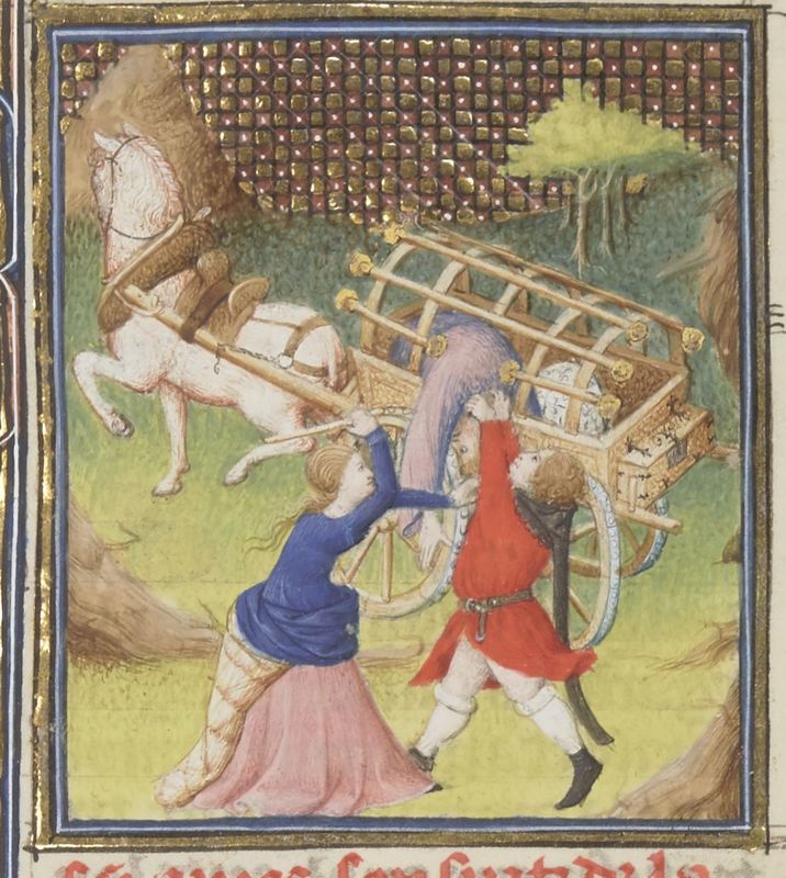 Parigi, Bibliothèque Nationale de France, Fr. 12420, f. 96r. Claudia impedisce che suo padre venga gettato giù dal carro trionfale.