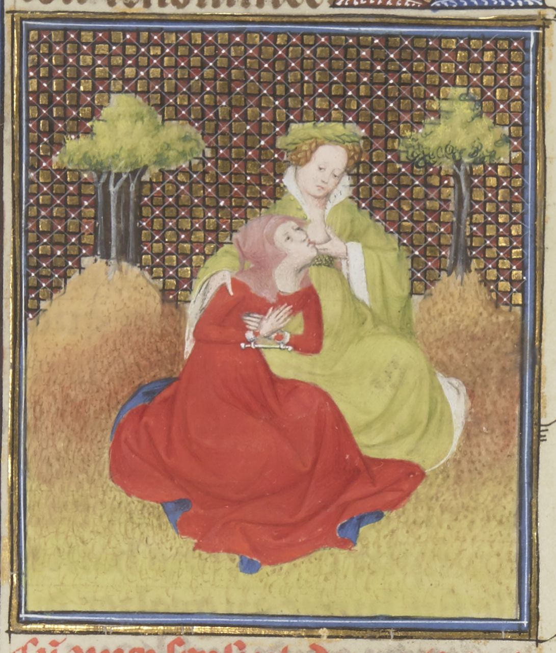 Parigi, Bibliothèque Nationale de France, Fr. 12420, f. 100r. Una giovane donna romana offre il seno alla madre ammanettata per sfamarla.