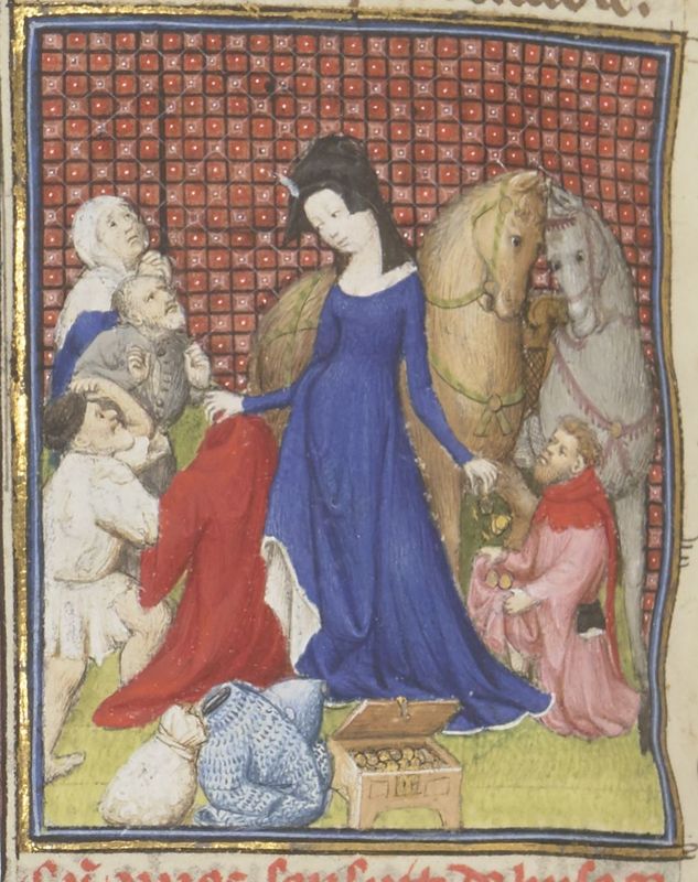 Parigi, Bibliothèque Nationale de France, Fr. 12420, f. 104v. Busa di Canosa distribuisce vestiti, armature e denaro ai soldati romani.
