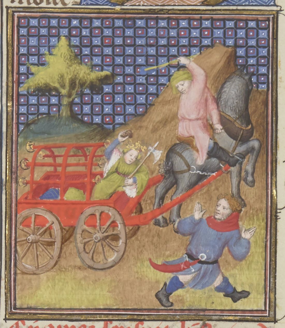 Parigi, Bibliothèque Nationale de France, Fr. 12420, f. 110r. Beronice insegue gli assassini del figlio su un carro da guerra.
