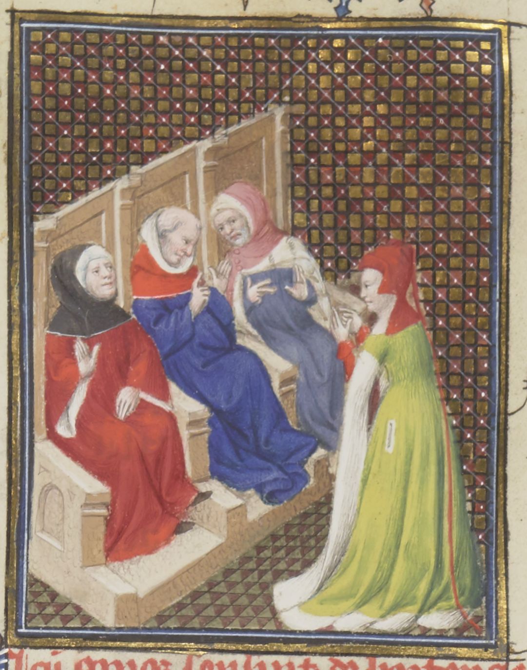 Parigi, Bibliothèque Nationale de France, Fr. 12420, f. 125r. Ortensia perora la causa delle donne romane dinanzi ai triumviri.