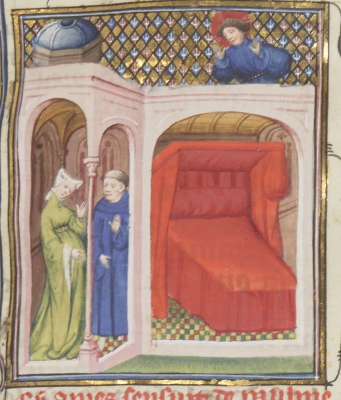 Parigi, Bibliothèque Nationale de France, Fr. 12420, f. 136r. Paolina viene corteggiata dal sacerdote Mondo, che si fa passare per il dio Anubi.