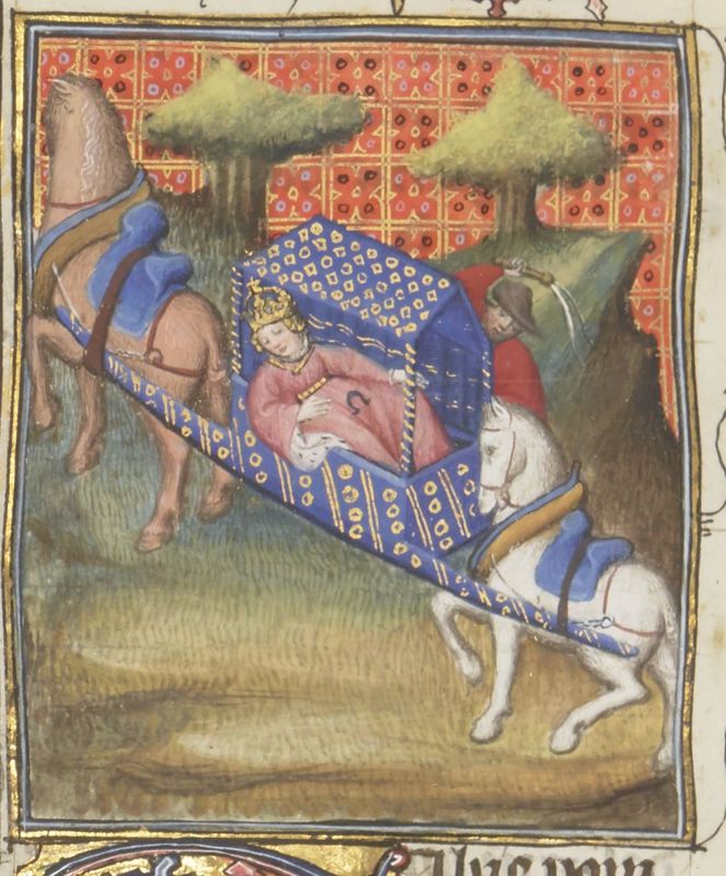 Parigi, Bibliothèque Nationale de France, Fr. 12420, f. 143v. Poppea Sabina, moglie di Nerone, viene portata via in lettiga (sul suo ventre è disegnato un ferro di cavallo, forse in riferimento alla diceria secondo cui Nerone l'avrebbe uccisa a calci).