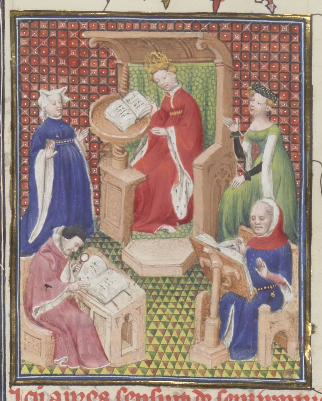 Parigi, Bibliothèque Nationale de France, Fr. 12420, f. 150r. Semiamira presiede il senaculum delle matrone romane.