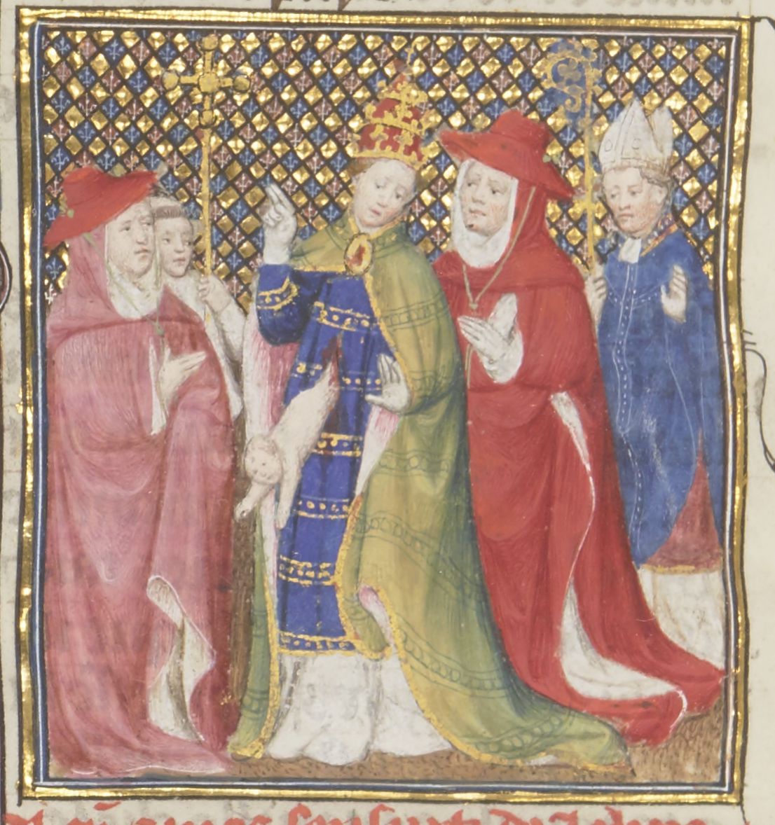 Parigi, Bibliothèque Nationale de France, Fr. 12420, f. 155v. La papessa Giovanna dà alla luce un bambino durante una processione religiosa.