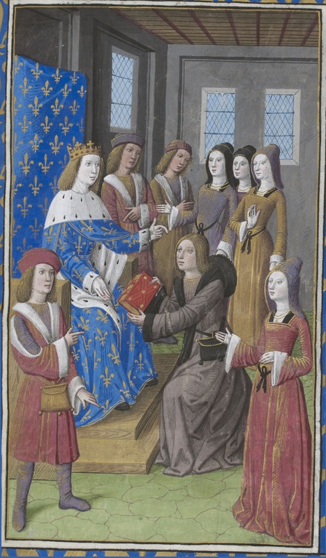Parigi, Bibliothèque Nationale de France, Vélins 1223, f. a3r. Incunabolo miniato stampato a Parigi da Antoine Vérard il 26/04/1493. Antoine Vérard offre il libro a re Carlo VIII dinanzi ad Anna di Bretagna e gli altri membri della corte.