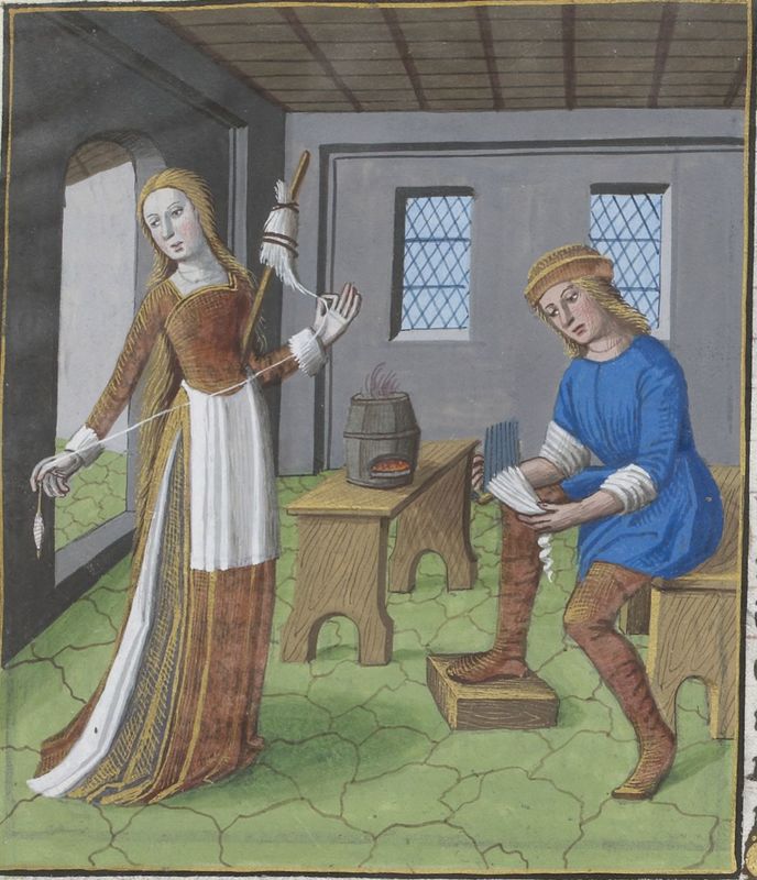 Parigi, Bibliothèque Nationale de France, Vélins 1223, f. b7r. Incunabolo miniato stampato a Parigi da Antoine Vérard il 26/04/1493. La dea Minerva fila alla conocchia mentre un servo carda la lana.