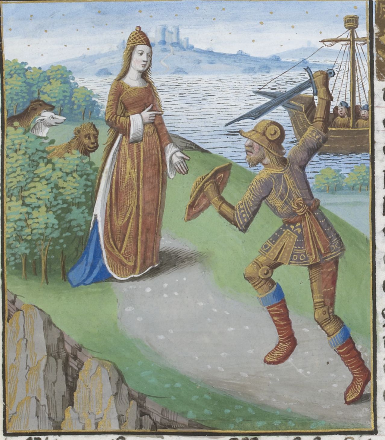 Parigi, Bibliothèque Nationale de France, Vélins 1223, f. f5r. Incunabolo miniato stampato a Parigi da Antoine Vérard il 26/04/1493. La maga Circe confronta Ulisse; tra gli alberi si trovano i compagni del guerriero trasformati in animali.