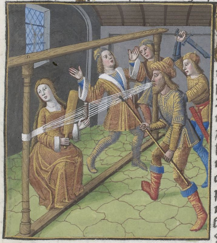 Parigi, Bibliothèque Nationale de France, Vélins 1223, f. f8r. Incunabolo miniato stampato a Parigi da Antoine Vérard il 26/04/1493. Penelope siede al telaio mentre Ulisse uccide i Proci.