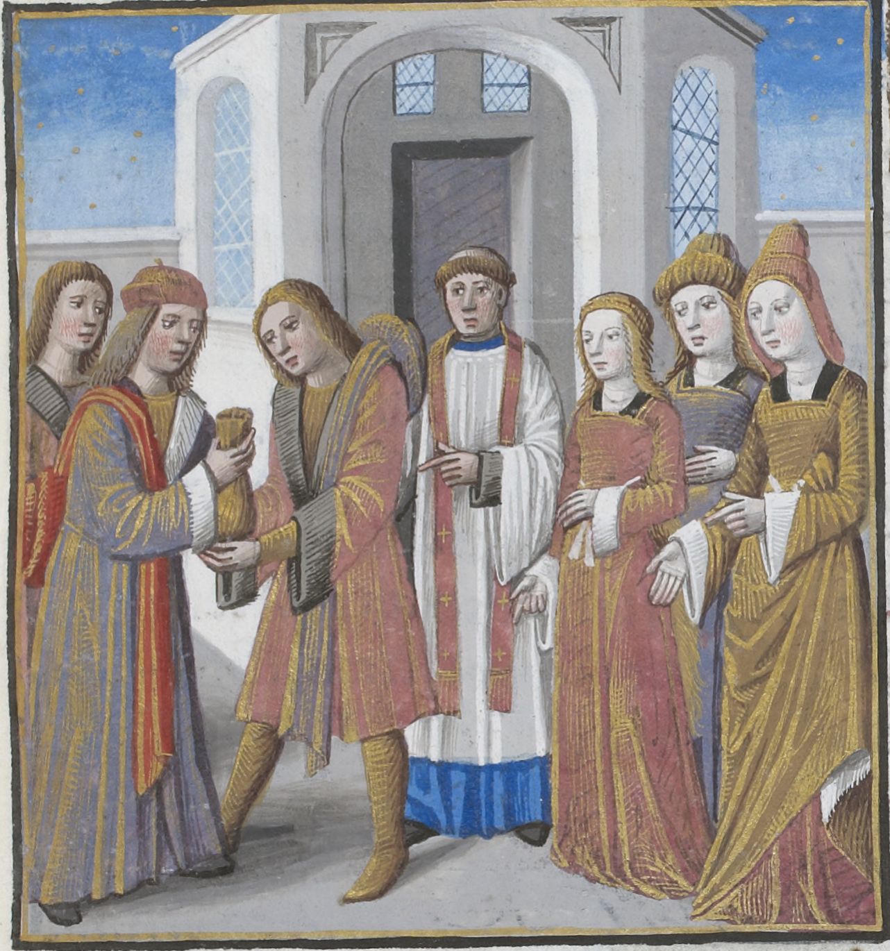 Maestro di Jacques de Besançon (1493), Megulia Dotata riceve la dote per il matrimonio