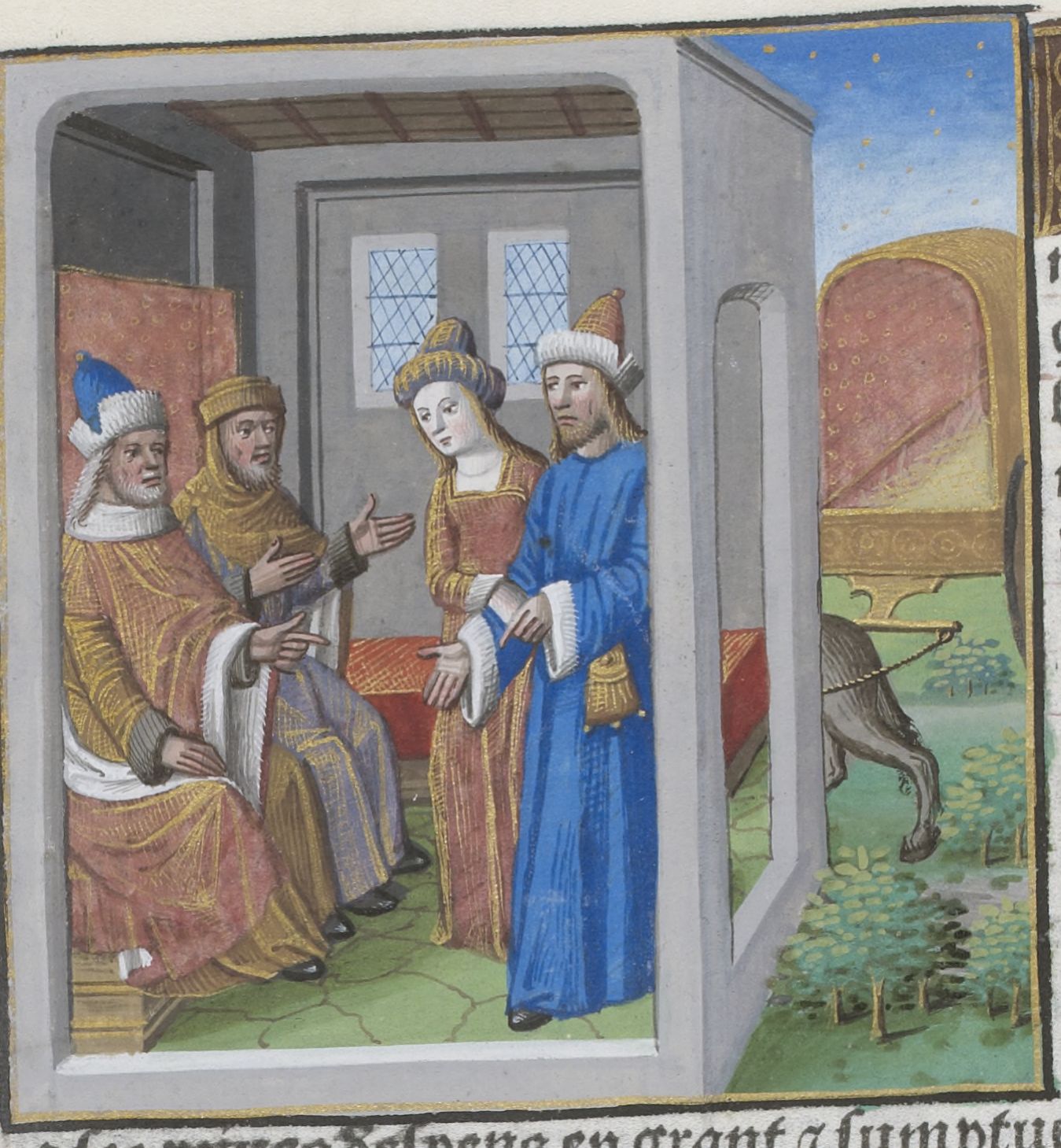 Parigi, Bibliothèque Nationale de France, Vélins 1223, f. l4v. Incunabolo miniato stampato a Parigi da Antoine Vérard il 26/04/1493. Claudia accompagna il padre dinanzi al senato; all'esterno è raffigurato il carro su cui hanno viaggiato.