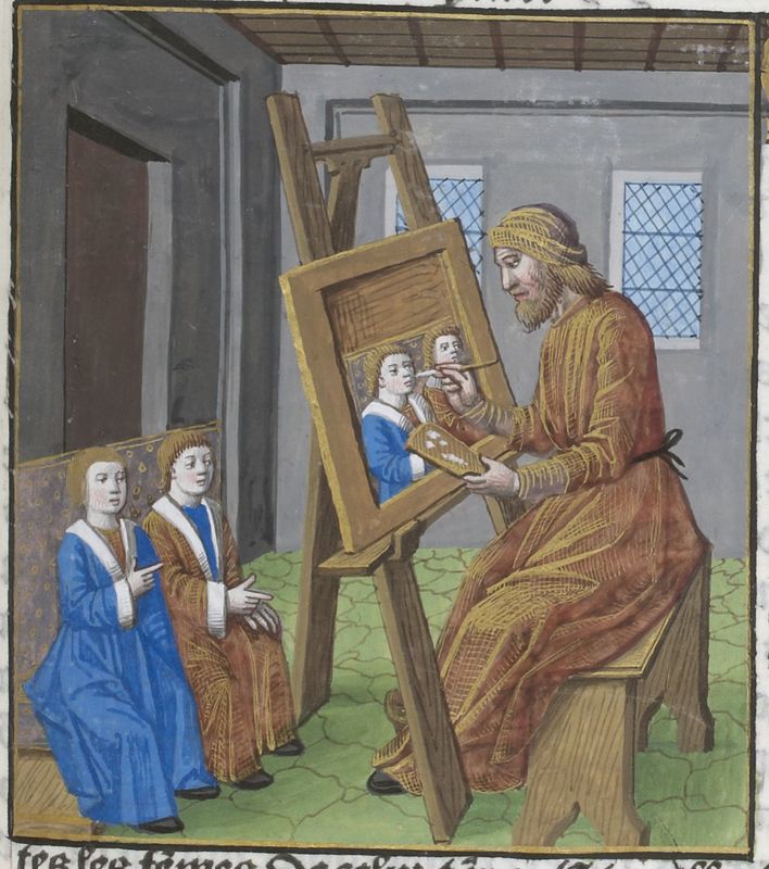 Parigi, Bibliothèque Nationale de France, Vélins 1223, f. o4r. Incunabolo miniato stampato a Parigi da Antoine Vérard il 26/04/1493. Un pittore esegue il ritratto dei due figli della regina Marianna.