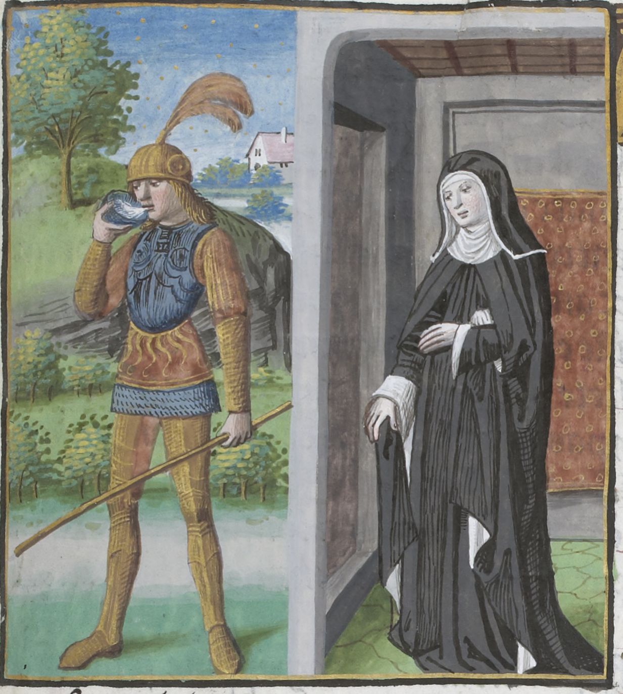 Parigi, Bibliothèque Nationale de France, Vélins 1223, f. p3r. Incunabolo miniato stampato a Parigi da Antoine Vérard il 26/04/1493. Antonia rimane vedova dopo la morte di Druso.