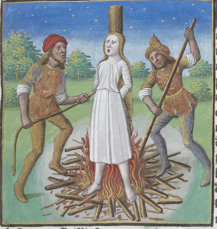 Parigi, Bibliothèque Nationale de France, Vélins 1223, f. q5r. Incunabolo miniato stampato a Parigi da Antoine Vérard il 26/04/1493. Poppea Sabina, moglie di Nerone, viene bruciata sul rogo.