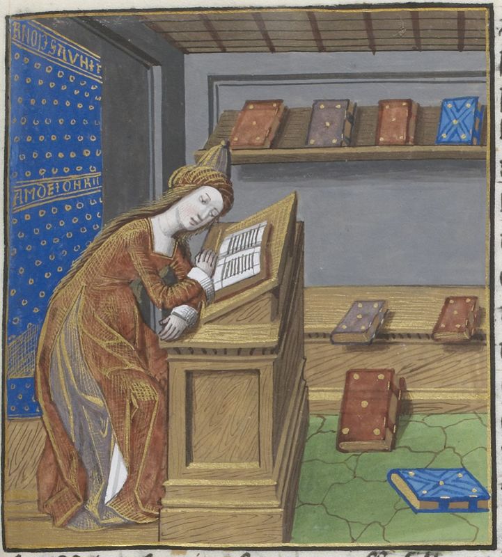 Parigi, Bibliothèque Nationale de France, Vélins 1223, f. q8r. Incunabolo miniato stampato a Parigi da Antoine Vérard il 26/04/1493. Proba legge allo scrittoio nel suo studio.