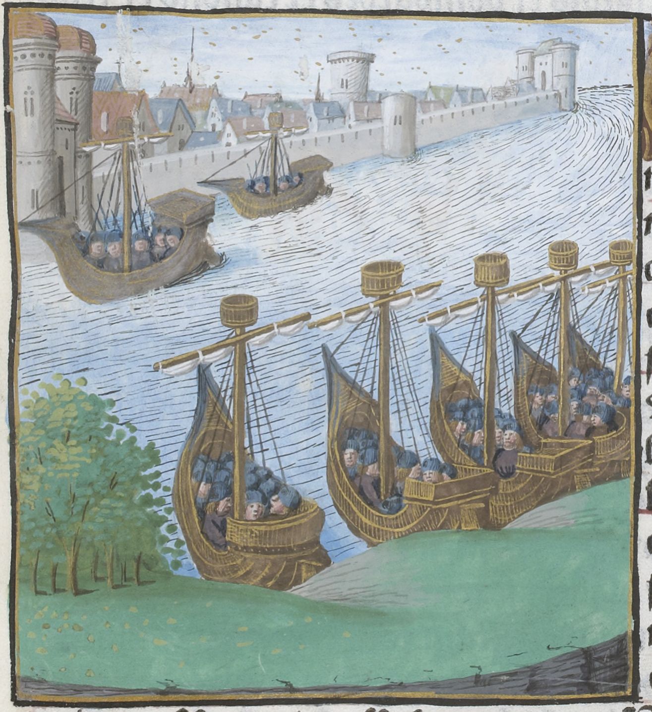 Parigi, Bibliothèque Nationale de France, Vélins 1223, f. s5r. Incunabolo miniato stampato a Parigi da Antoine Vérard il 26/04/1493. Un attacco navale in Sicilia.