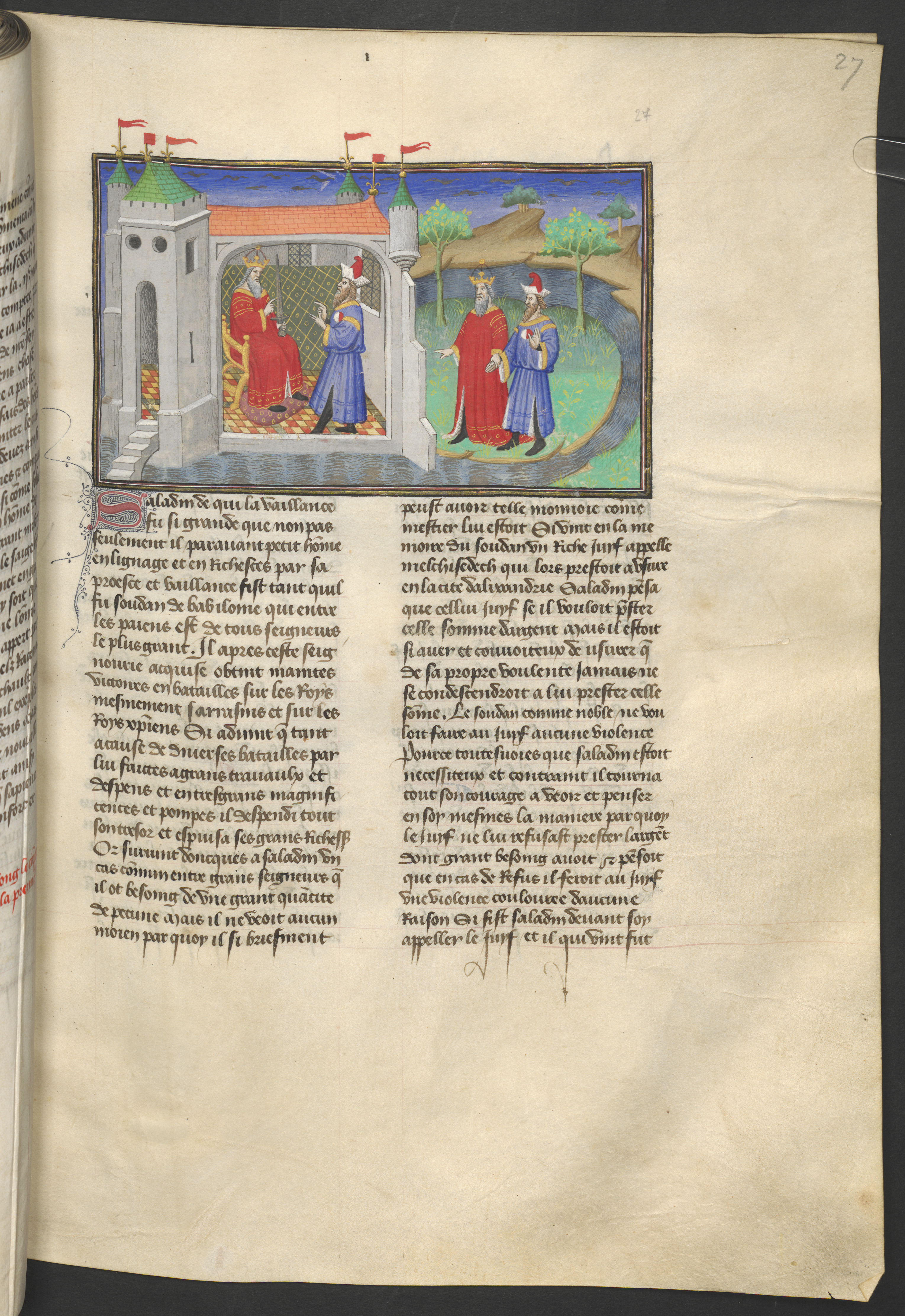 Vienna, Österreichische Nationalbibliothek, 2561, f. 27r. Al cospetto del Saladino, Melchisedech racconta la parabola dei tre anelli; i due uomini, divenuti amici, passeggiano nel giardino.