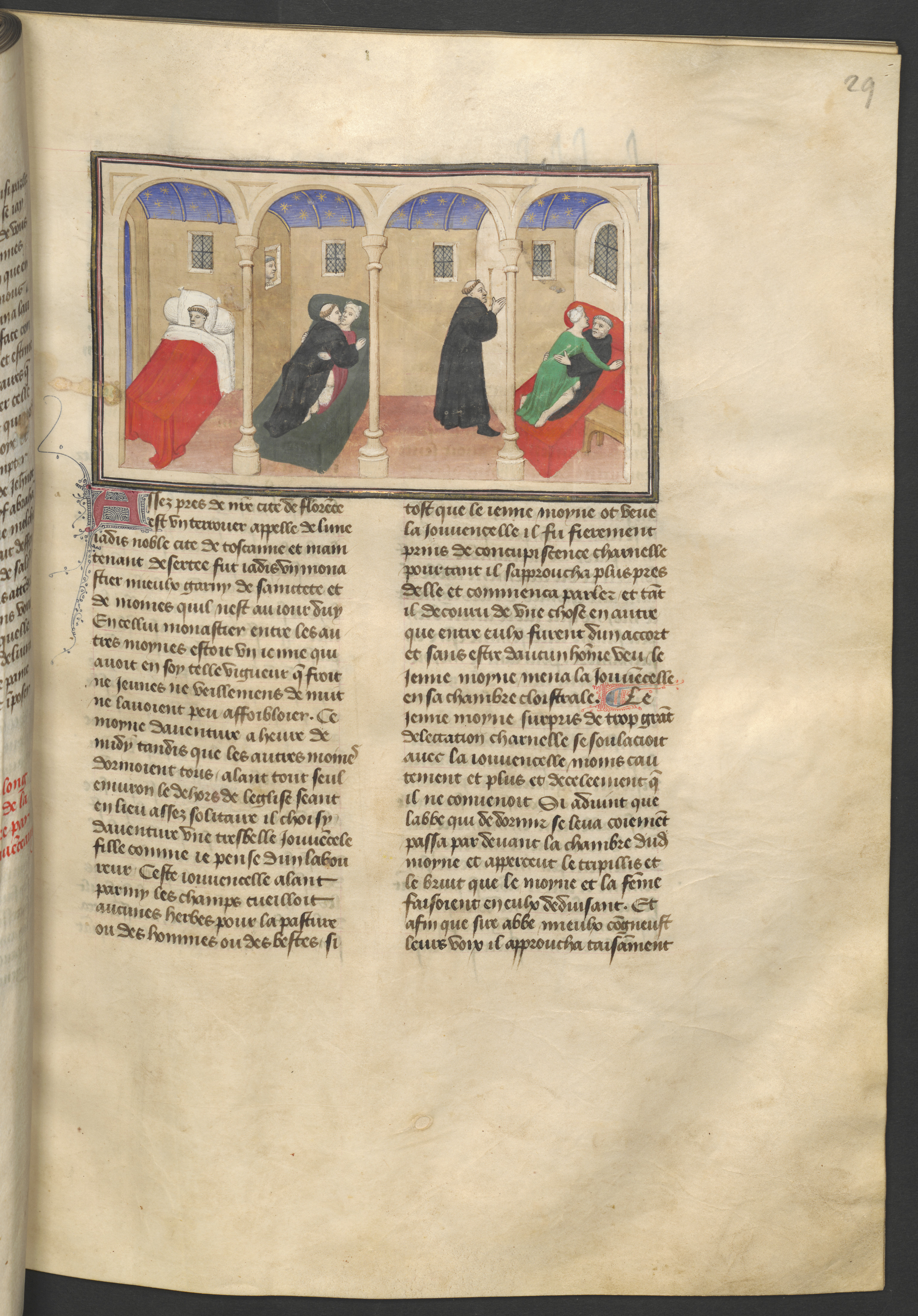 Vienna, Österreichische Nationalbibliothek, 2561, f. 29r. L'abate sorprende un giovane monaco peccare di lussuria con una donna; in seguito il monaco, a sua volta, spia l'abate mentre giace con una donna nella sua cella.