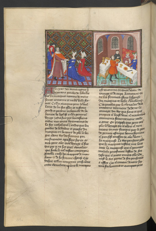 Vienna, Österreichische Nationalbibliothek, 2561, f. 31v. La marchesa del Monferrato accoglie nella sua dimora il re Filippo il Bornio ed il suo seguito; la marchesa offre al re un banchetto a base di galline.