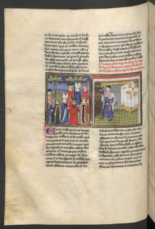 Vienna, Österreichische Nationalbibliothek, 2561, f. 42v. L'anziano Alberto da Bologna osserva Margherita dei Ghisolieri danzare con un gruppo di giovani donne; invitato in casa della donna, Alberto prende un porro per spiegare la natura del suo amore.