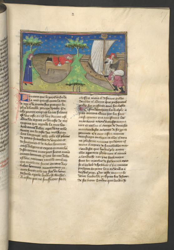 Vienna, Österreichische Nationalbibliothek, 2561, f. 57r. Landolfo Rufolo, salvatosi dal naufragio aggrappato ad una cassa, viene tirato a riva da una lavandaia; Landolfo, recuperate le sue ricchezze, salpa nuovamente verso casa.