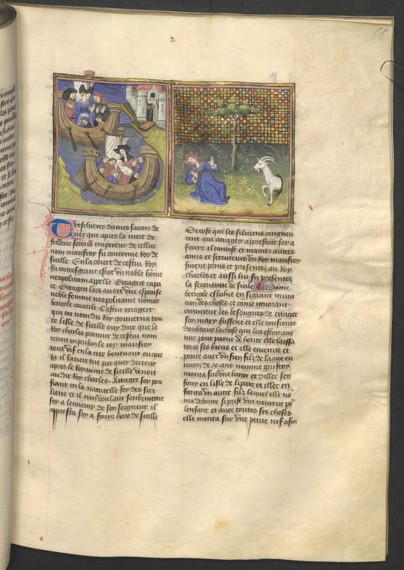 Vienna, Österreichische Nationalbibliothek, 2561, f. 66r. Beritola, con il figlio in fasce ed il resto del suo seguito, fugge dalla Sicilia con due navi; Beritola, abbandonata sull'isola di Ponza, vede una capra uscire da una grotta.