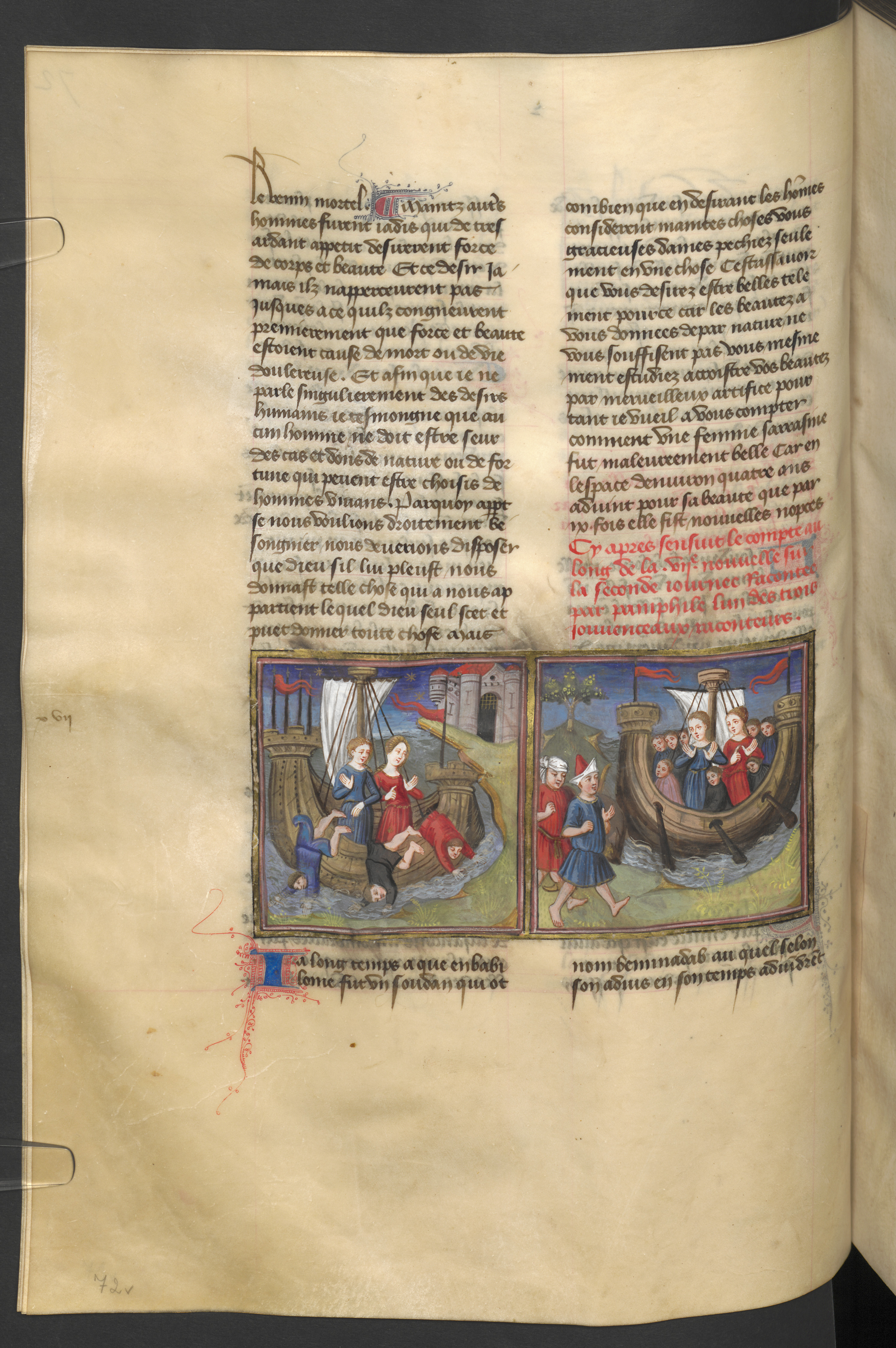 Vienna, Österreichische Nationalbibliothek, 2561, f. 72v. I marinai abbandonano la nave di Alatiel lasciando la fanciulla e la sua ancella in balia di una tempesta; Pericone da Visalgo soccorre Alatiel e le sue ancelle.