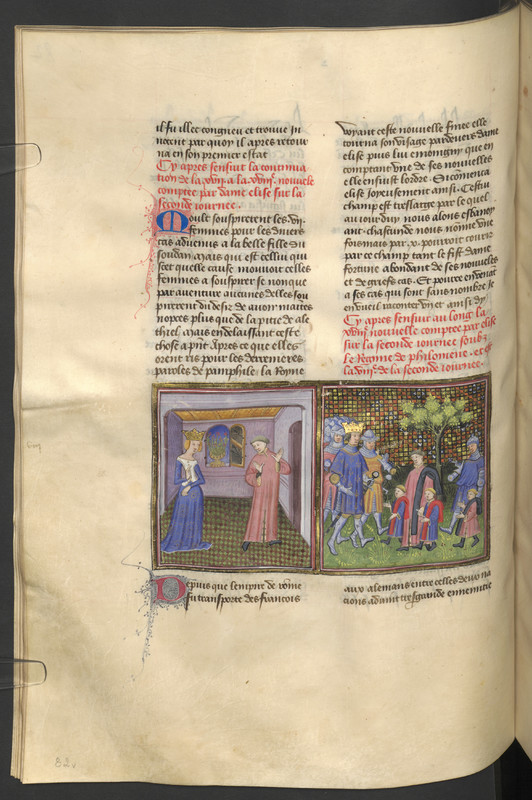 Vienna, Österreichische Nationalbibliothek, 2561, f. 82v. La moglie del re di Francia accusa Gualtieri, conte d'Aversa, di averla violentata, costringendo il conte alla fuga; il nuovo re di Francia restituisce titoli e ricchezze a Gualtieri ed ai suoi figli.