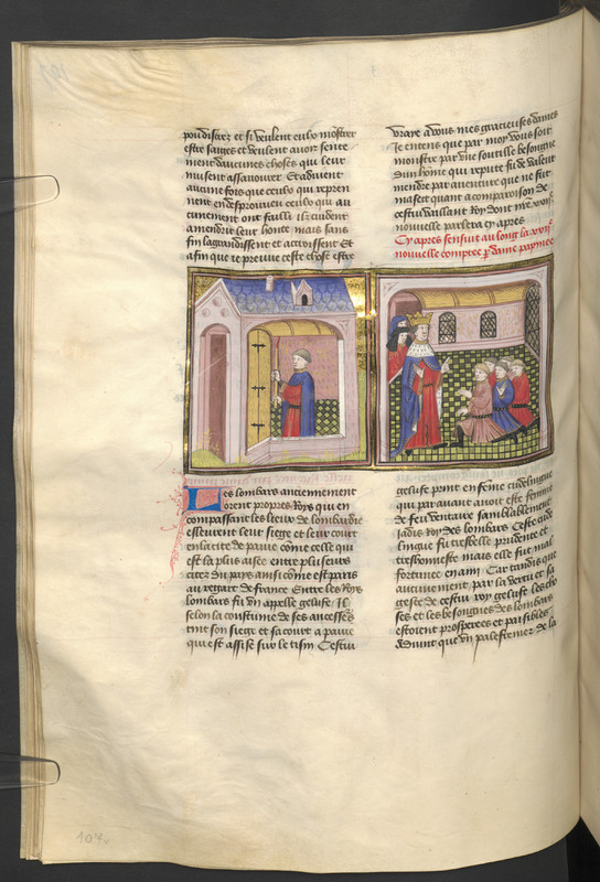Miniatore francese (1425-1450), Un palafreniere bussa alla porta della regina travestito da re; il re confronta i propri servitori