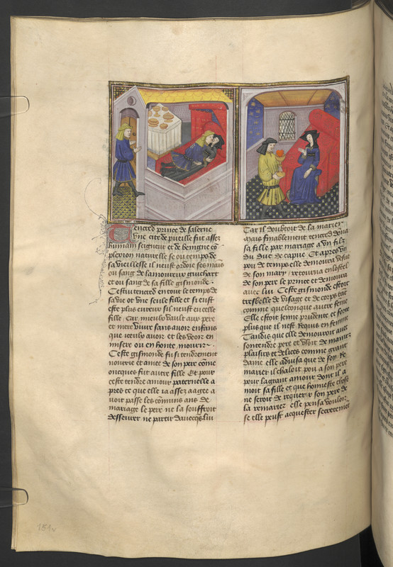 Vienna, Österreichische Nationalbibliothek, 2561, f. 151v. Ghismonda giace con Guiscardo, spiata dal padre Tancredi attraverso una porta; Tancredi consegna alla figlia il cuore dell'amato in una coppa.