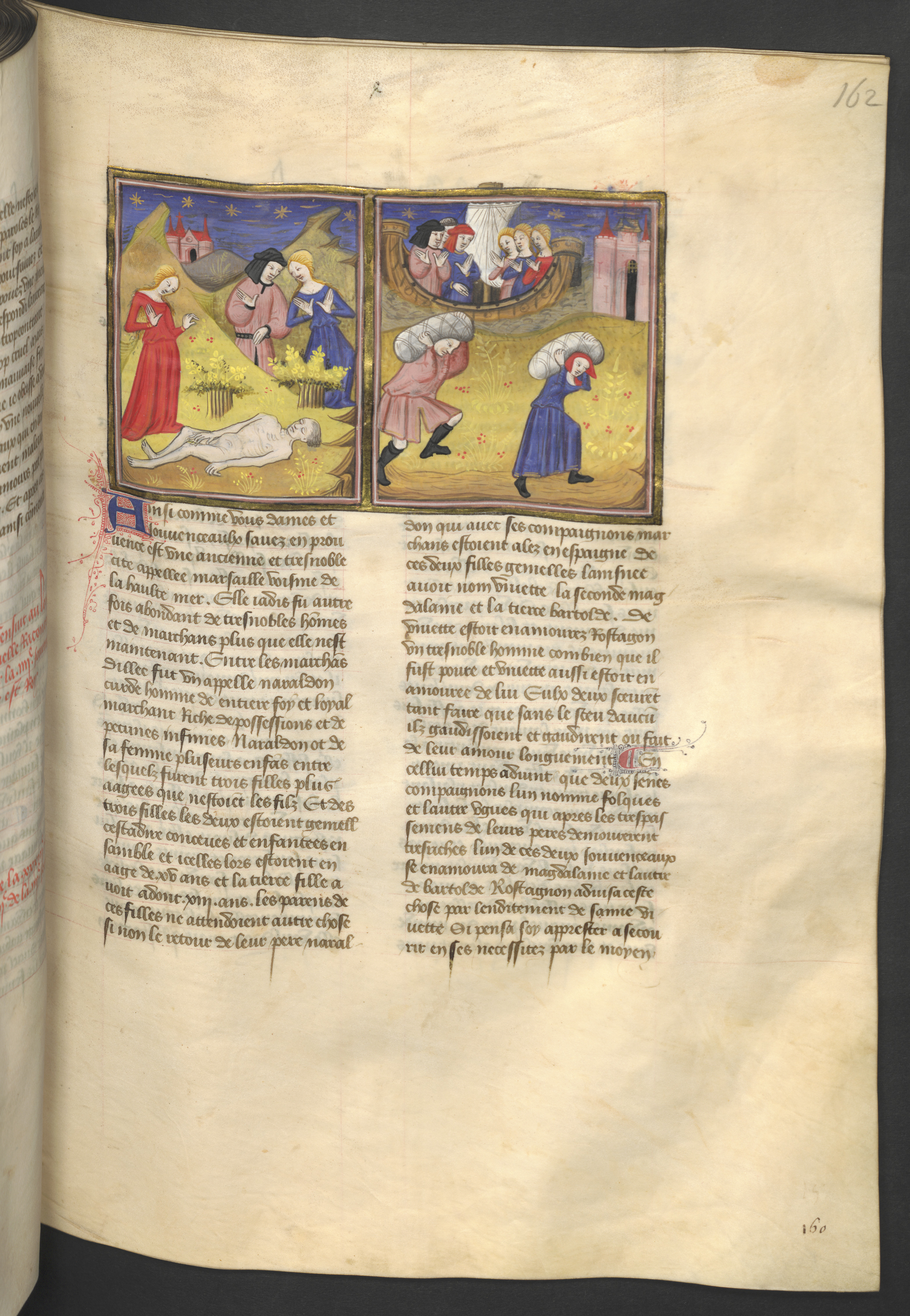 Vienna, Österreichische Nationalbibliothek, 2561, f. 162r. Ninetta scopre il cadavere del suo amante Restagnone, mentre la sorella Maddalena si rivolge all'amante Folco; le tre coppie di amanti navigano verso Creta; Bertella e Ughetto fuggono verso Rodi con i loro beni in spalla.