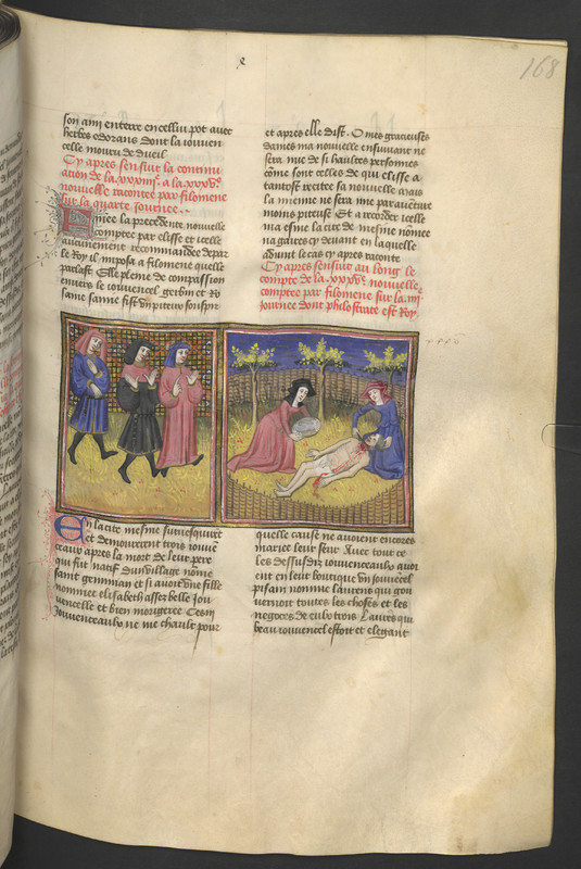 Vienna, Österreichische Nationalbibliothek, 2561, f. 168r. I tre fratelli di Lisabetta si recano da Lorenzo per ucciderlo; Lisabetta, con l'aiuto di un domestica, dissotterra il corpo dell'amato, gli taglia la testa e la nasconde in un vaso di basilico.