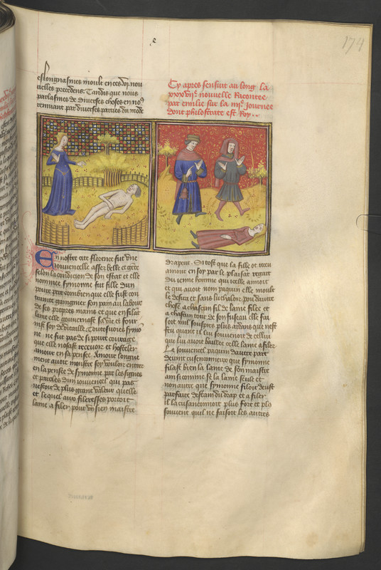 Vienna, Österreichische Nationalbibliothek, 2561, f. 174r. Simona piange sul corpo di Pasquino, avvelenato dalla salvia; per dimostrare la propria innocenza, Simona muore anch'essa avvelenata di fronte al giudice.