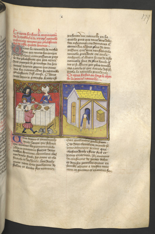 Vienna, Österreichische Nationalbibliothek, 2561, f. 179r. Guiglielmo Rossiglione fa servire alla moglie il cuore dell'amante, Guiglielmo Guardastagno; la donna si getta dalla finestra.