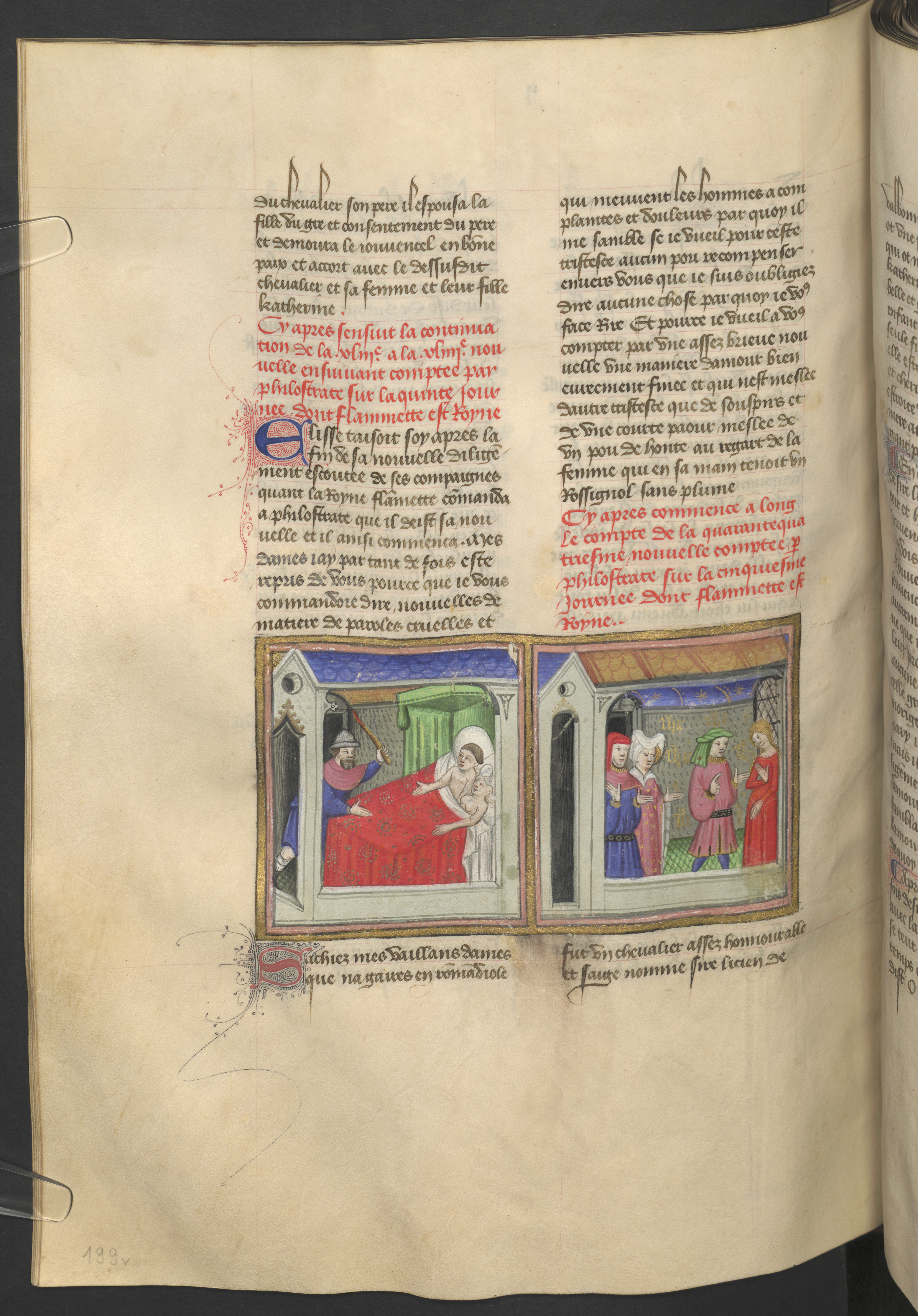 Vienna, Österreichische Nationalbibliothek, 2561, f. 199v. Lizio da Valbona sorprende la figlia Caterina a letto con l'amante Ricciardi; Lizio acconsente al matrimonio della coppia.