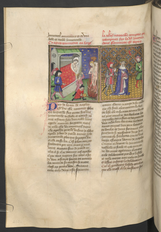 Vienna, Österreichische Nationalbibliothek, 2561, f. 205v. Gianni di Procida e Restituta vengono scoperti a letto insieme dal re Federigo d'Aragona, quindi vengono condannati al rogo; re Federigo viene scortato da un alabardiere.