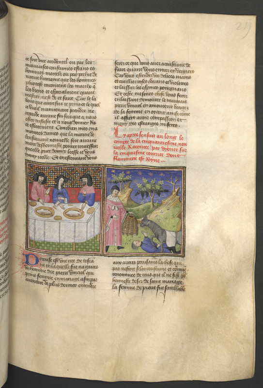 Miniatore francese (1425-1450), Pietro di Vinciolo siede a tavola con la moglie e l'amante di lei; Pietro scopre l'amante calpestato da un asino