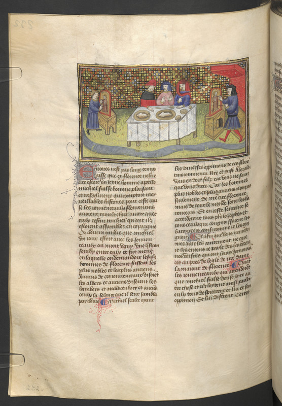 Vienna, Österreichische Nationalbibliothek, 2561, f. 232v. Michele Scalza discute con i suoi amici a tavola (al centro); Dio bambino impara a disegnare (a sinistra); Dio adulto dipinge una pala d'altare (a destra).