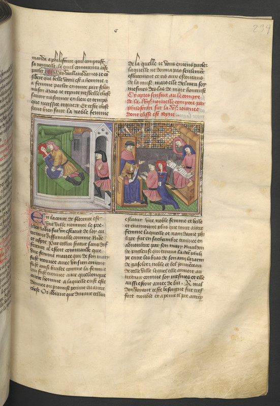 Vienna, Österreichische Nationalbibliothek, 2561, f. 234r. Filippa viene scoperta dal marito durante l'adulterio; la donna si difende dinanzi al giudice e fa cambiare lo statuto della città di Prato.