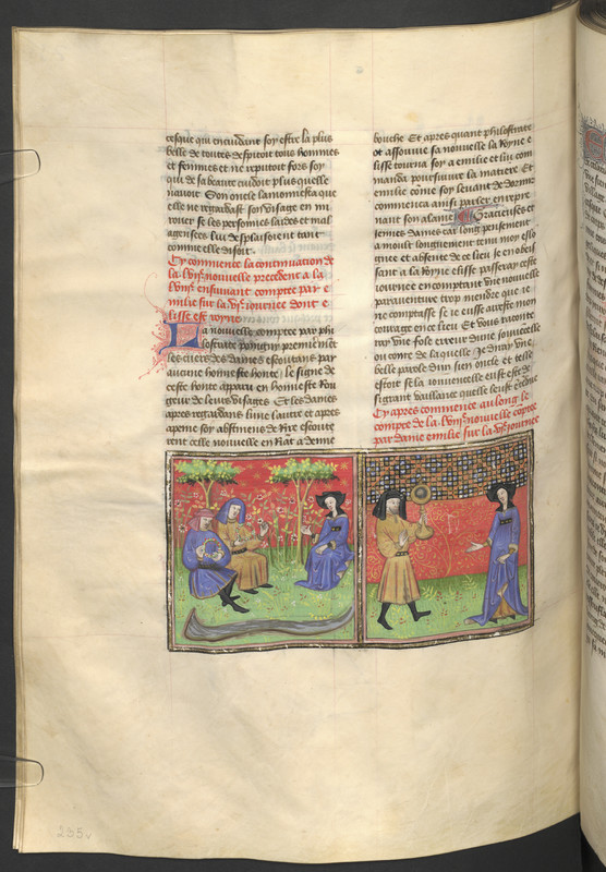 Vienna, Österreichische Nationalbibliothek, 2561, f. 235v. Cesca disdegna altezzosamente le attenzioni di due uomini; lo zio Fresco da Celatico porge alla donna uno specchio, consigliandole di non specchiarsi mai più.