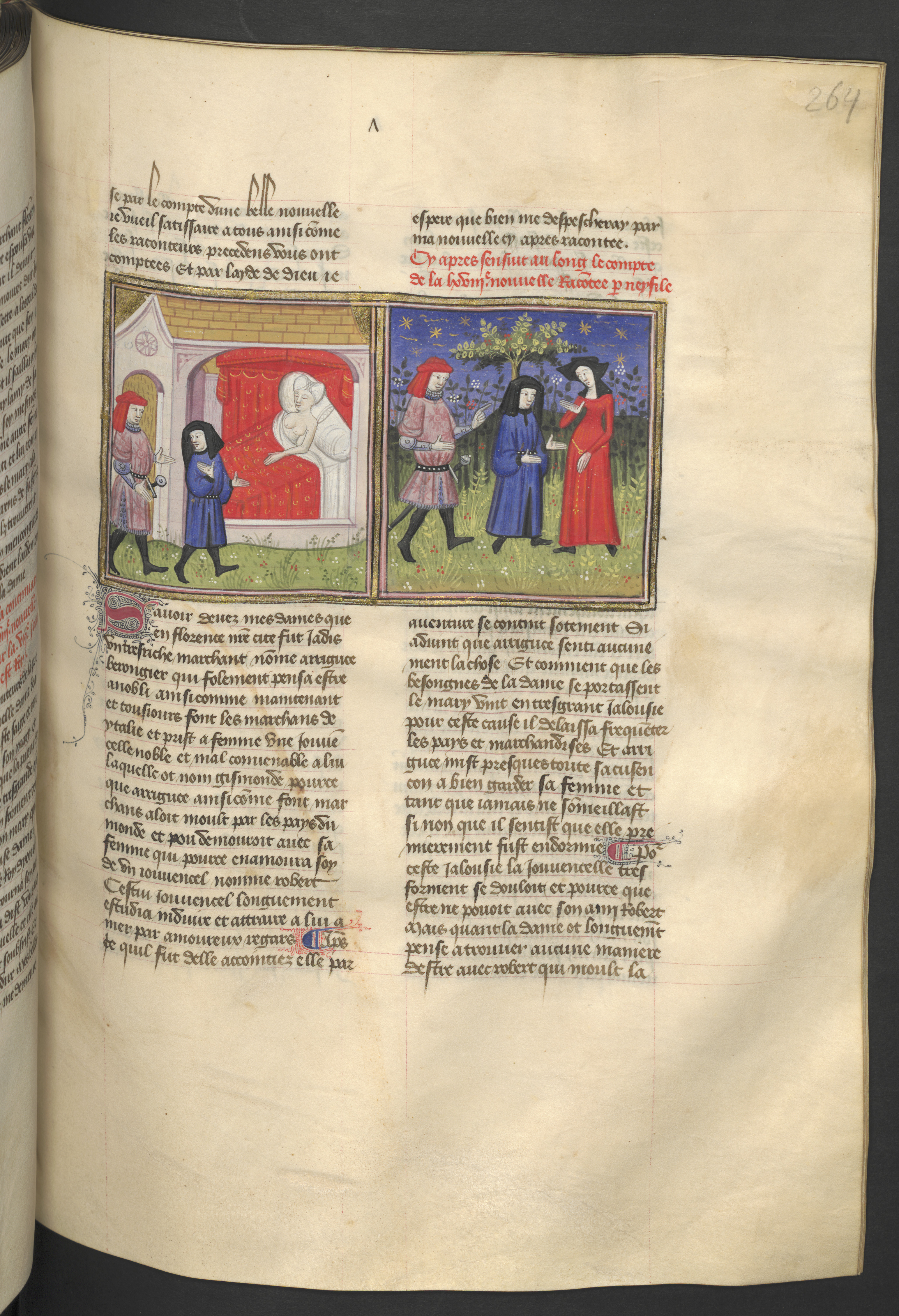 Vienna, Österreichische Nationalbibliothek, 2561, f. 264r. Arriguccio insegue Ruberto fuori la camera da letto dove dorme la moglie; la moglie di Arriguccio accusa il marito davanti ai suoi fratelli.