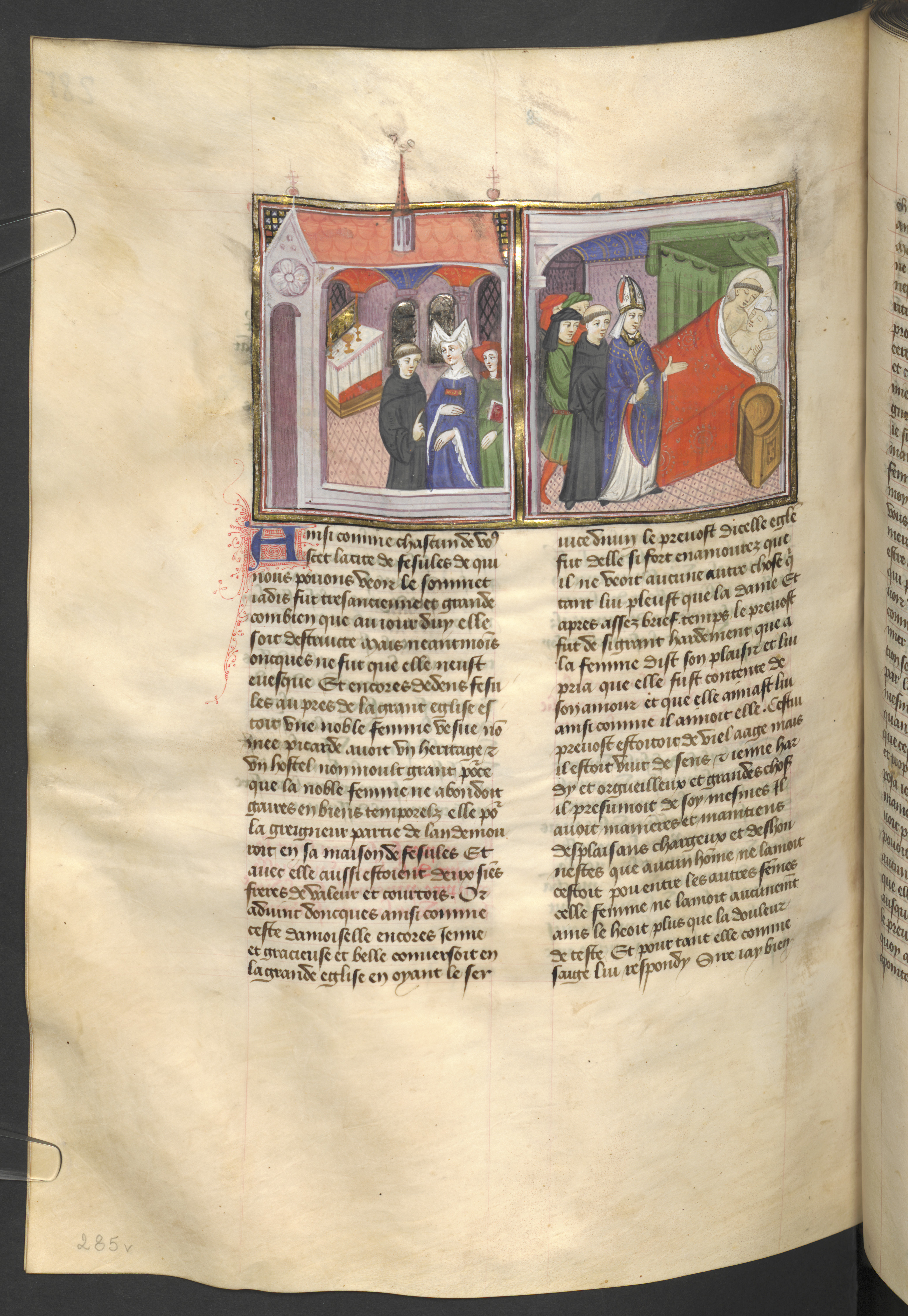 Miniatore francese (1425-1450), Monna Piccarda visita il parroco di Fiesole; il parroco viene sorpreso dal vescovo a letto con la serva