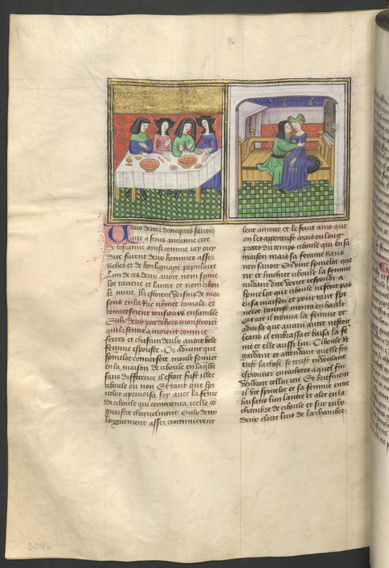 Vienna, Österreichische Nationalbibliothek, 2561, f. 304v. Spinelloccio e Zeppa siedono a tavola con le loro mogli; Zeppa si bacia con la moglie di Spinelloccio sopra la cassa dove è rinchiuso quest'ultimo.