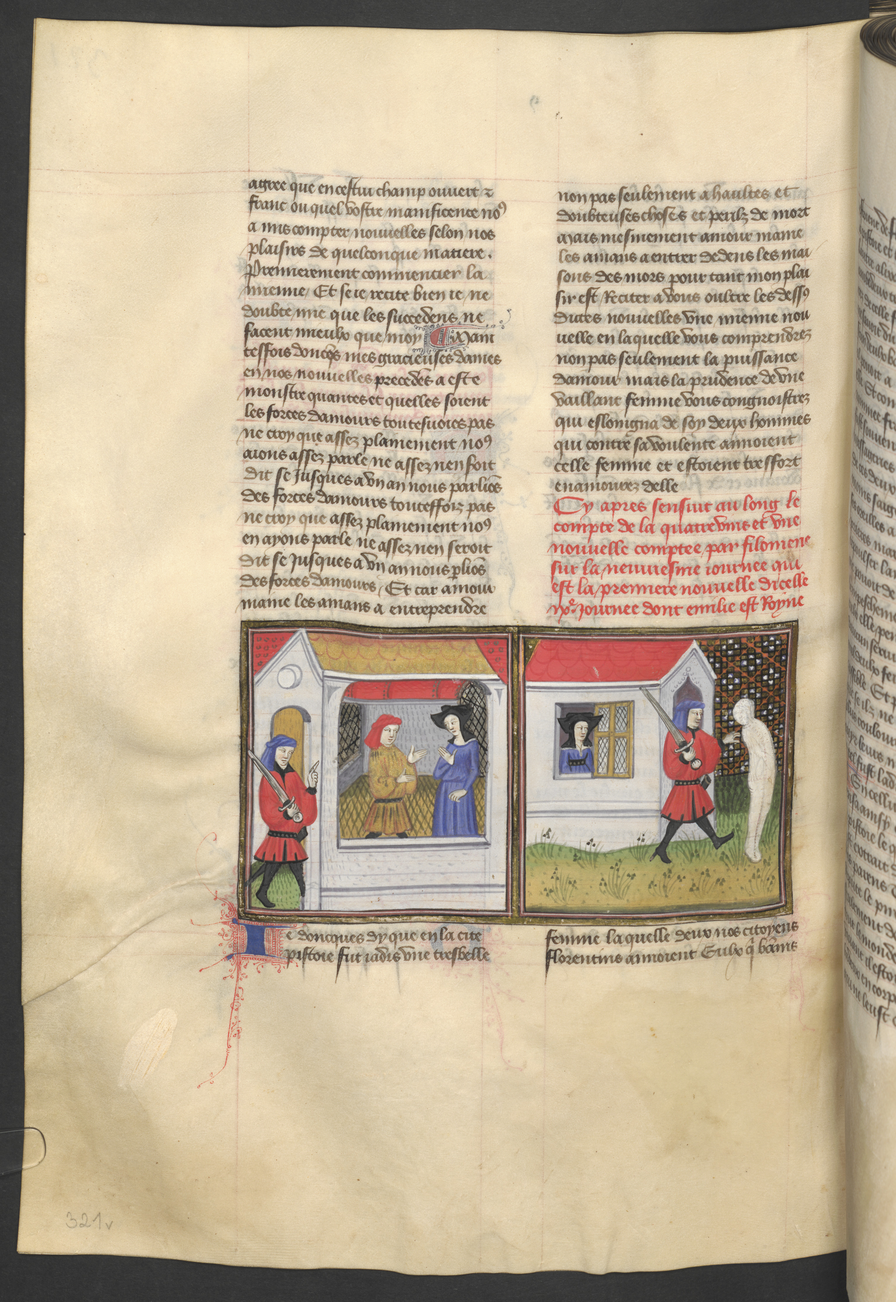 Vienna, Österreichische Nationalbibliothek, 2561, f. 321v. Monna Francesca affida un compito ciascuno a Rinuccio e Alessandro; dalla propria finestra la donna osserva Rinuccio e Alessandro, quest'ultimo vestito in un sudario da morto, fuggire dalle guardie.
