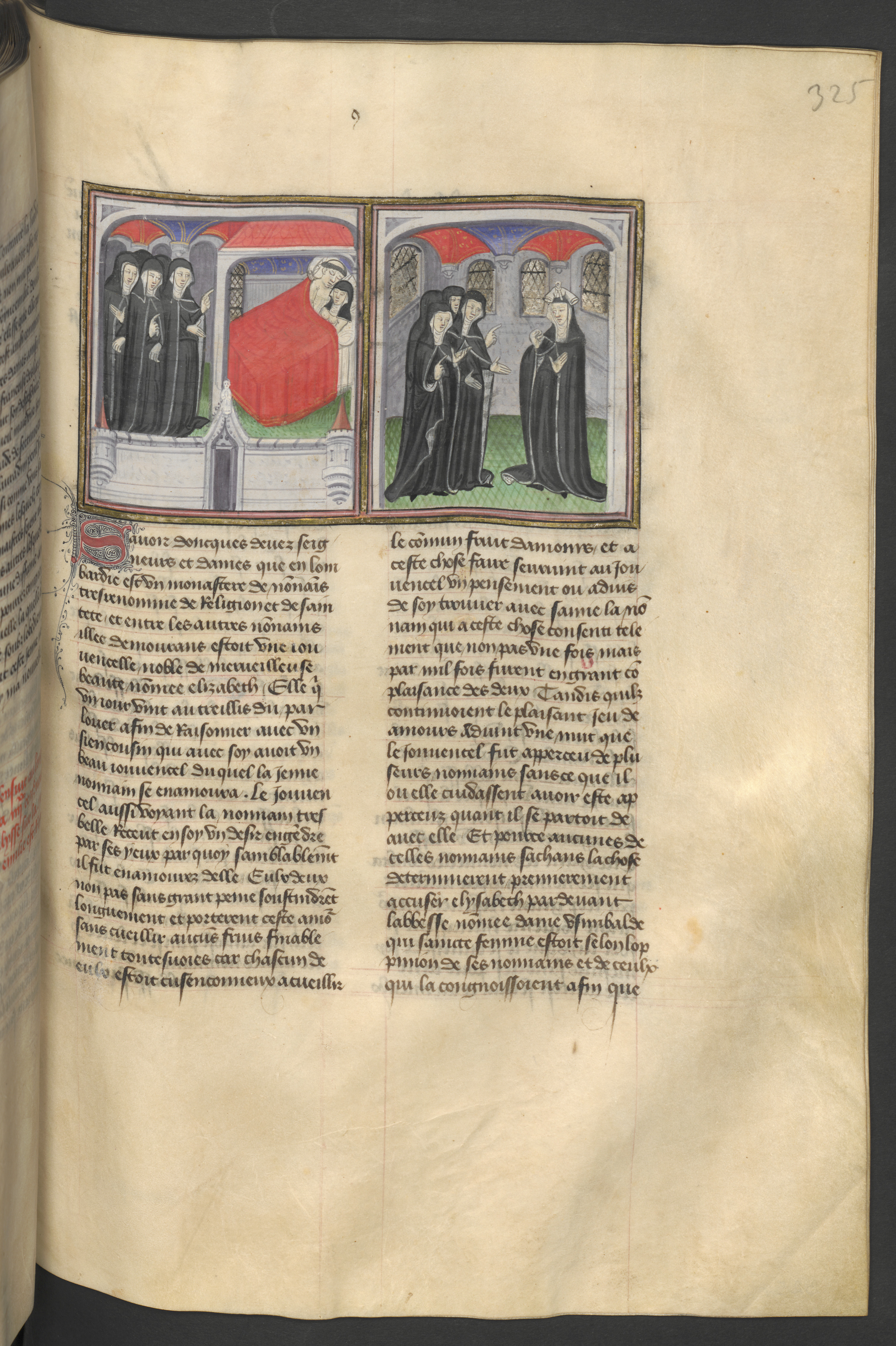 Vienna, Österreichische Nationalbibliothek, 2561, f. 325r. La monaca Isabetta viene sorpresa giacere a letto con un amante; la badessa tenta di rimproverare Isabetta, la quale le fa notare di avere indossato le braghe di un prete al posto del velo.
