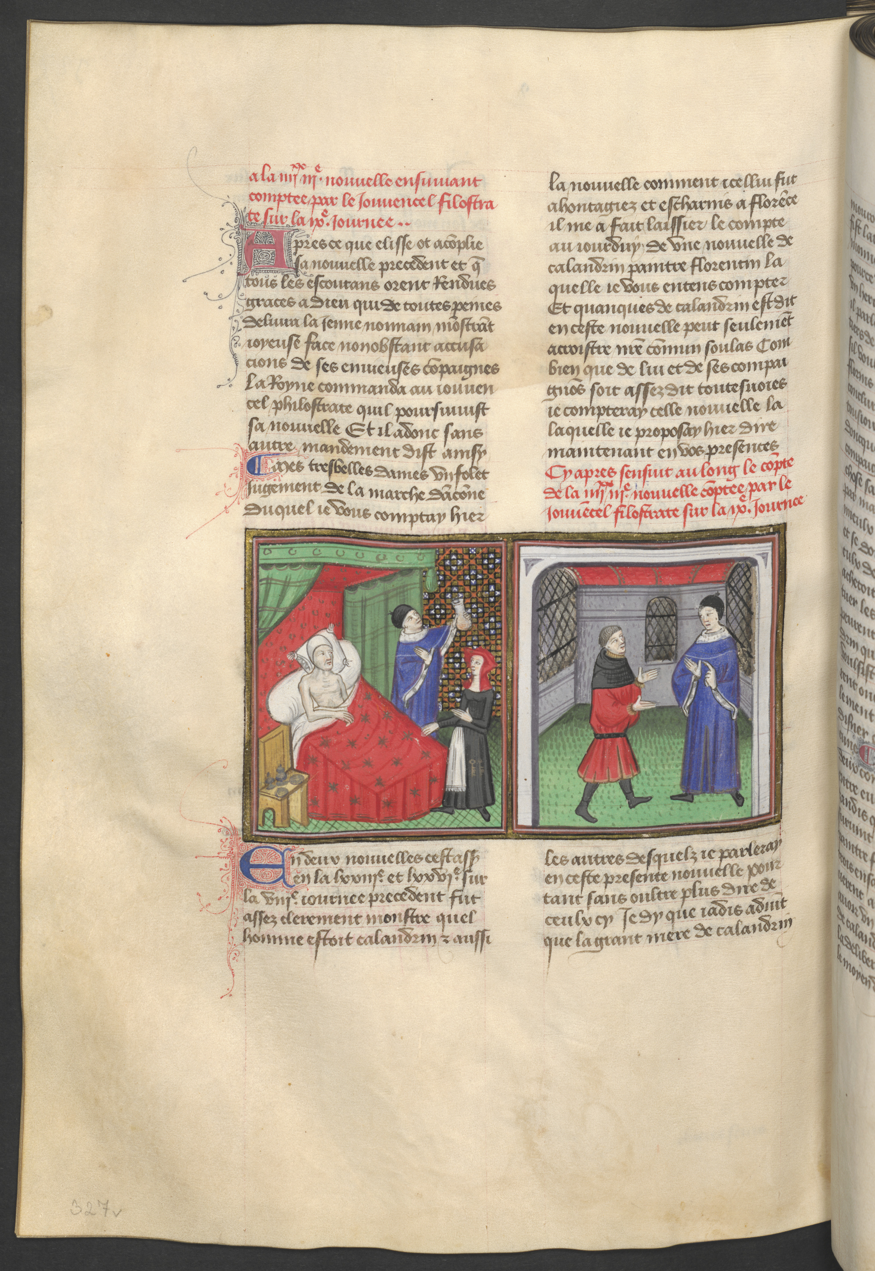 Vienna, Österreichische Nationalbibliothek, 2561, f. 327v. Il medico Simone consegna l'infuso a Calandrino, il quale crede di essere gravido; Calandrino, credendosi guarito, ringrazia il medico per i suoi servigi.