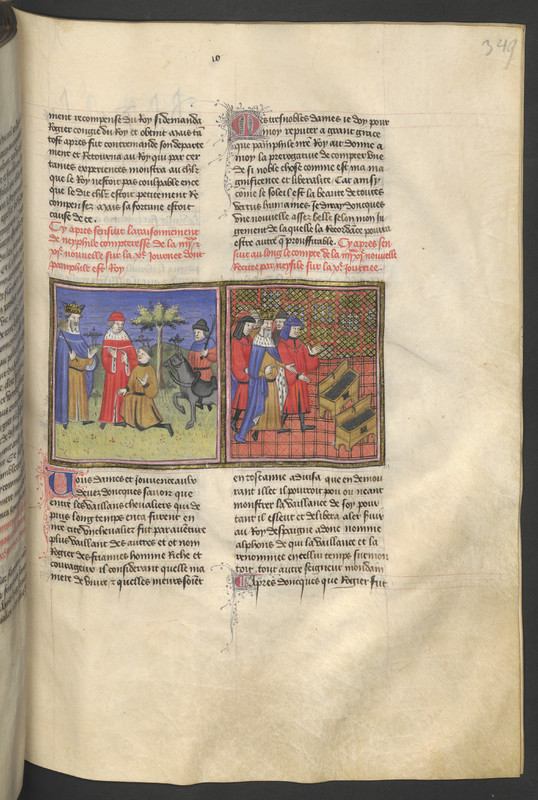 Vienna, Österreichische Nationalbibliothek, 2561, f. 349r. Ruggieri si congeda da re Alfonso d'Aragona ricevendo in dono una mula; il re invita Ruggieri a scegliere tra due forzieri.