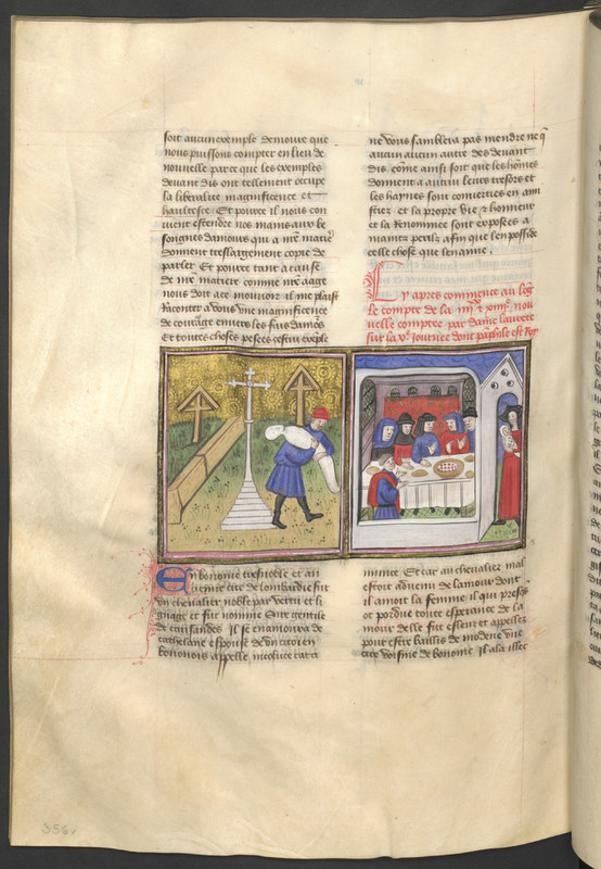 Vienna, Österreichische Nationalbibliothek, 2561, f. 356v. Gentile Carisendi salva Catalina dalla tomba dove ella era stata riposta perché creduta morta; durante un pranzo cui partecipa il marito di Catalina, Gentile rivela la presenza della donna e del figlio che essa ha partorito.